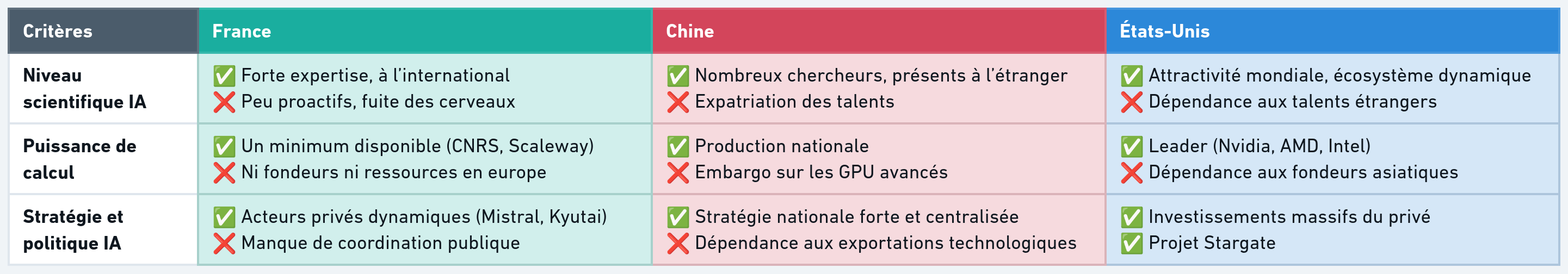 - The United States and China are accelerating thanks to coordinated initiatives (e.g. Stargate in the US), while Europe currently favors regulation.